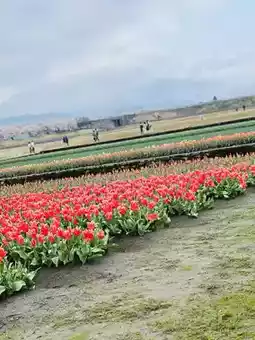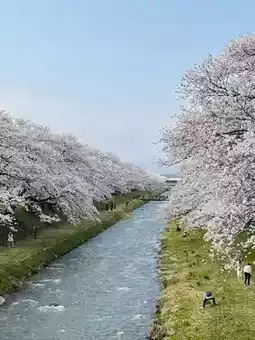 1,200m of about 280 Yoshino cherry trees were blooming along the bank, and in the foreground, it was supposed to be a quartet of tulips, rape blossoms, cherry blossoms, and the Tateyama mountain range, but this year the rape blossoms were late, so it didn't form a quartet, but it was still very beautiful.
