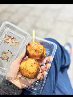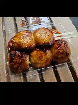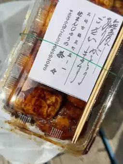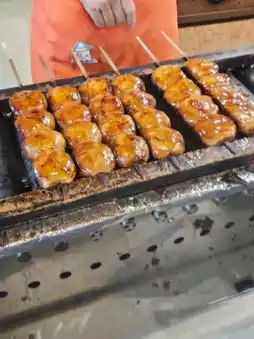 A fluffy manju skewer is smeared with a sweet and spicy miso sauce and grilled over a charcoal fire to create a fragrant skewer.