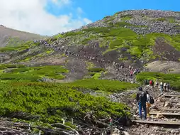 Travel from Osaka using the Hokuriku Takayama pass. Take the Thunderbird to Tsuruga, then transfer to the Shinkansen to Toyama, then take the JR Hida to Takayama, sleep in Takayama city. In the morning, take the bus to Norikura Mount for about 1.30 hours. The bus reaches the top of the mountain. The air is cool and comfortable. Keep walking. The path is rocky, be careful of slippery. Along the way, there is a blue pond, wild flowers, and people come to ski on the ice. Walking up to the top of 3000m takes 2 hours, walking down takes 1 hour.