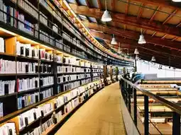 The open, atrium-style space has a design that gives off a warm wooden vibe 📚✨