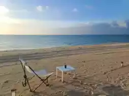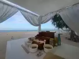 They also set up camping chairs and tables on the beach and transform it into a wonderful cafe facing the rising sun. They drink coffee at three places. They also enjoy the ocean from the pink wooden chairs with tents.