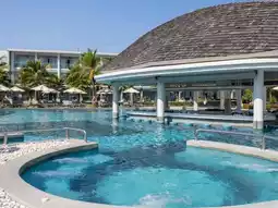 There are 7 swimming pools in total, with a shady atmosphere, a garden, and coconut trees along the beach.