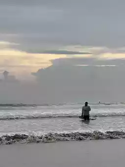 • First time surfing in the rain on Memories Beach. It was fun, getting wet all over but feeling light in the heart.