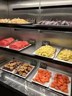 - **Fruit, Yogurt, and Cereal Station**: Includes fresh fruits, yogurts, grains, and cereals 🍉🍍🍊🍌.