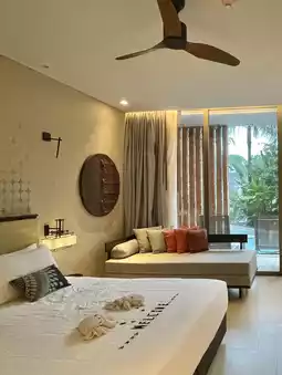 I booked a family suite with pool access during the rainy season. It rained all day, but I was impressed from the first step. The room was much larger than it looked in the pictures. It had two bedrooms, and it could sleep four people. The bed and pillows were soft and comfortable. The bathroom was spacious, and the balcony had direct access to the pool. The room was incredibly relaxing.