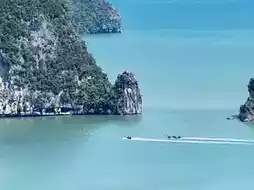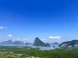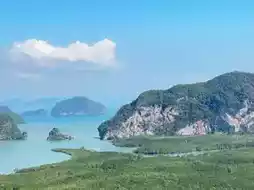 It's a beautiful view of the Phang Nga Bay. It has islands and mountains.