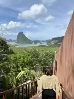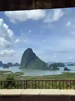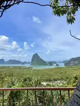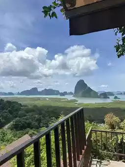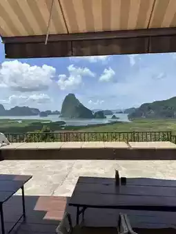 We can see a panoramic view of "Ao Phang Nga", overlooking the small and large islands and the green of the mountains, contrasting with the sky and the sea, which is a very beautiful picture. The cafe zone has 🍰 homemade cakes 🍷 drinks ☕️ fresh coffee