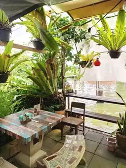 8 De Klong, a hidden riverside cafe in the Taling Chan area, is truly hidden. At first, I didn't expect the entrance to be so inviting. Once inside, the atmosphere is amazing. The owners are lovely. The uncle and auntie make their own drinks and coffee, and they offer excellent recommendations. The coffee and drinks are delicious. Prices start at just 50-60 baht, making it a great value. If you're nearby, stop by for food and other desserts.