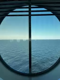 From the ferry window, the blue sea stretches out endlessly, offering a truly serene and beautiful view.