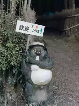 there is a Totoro wood carving? and a raccoon figurine as a landmark at the entrance.