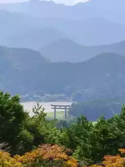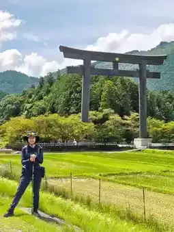 En route, we arrived at Mihara Terrace, offering a magnificent view of the former shrine grounds of Daisaigahara. Daisaigahara was once the site of Kumano Hongu Taisha, but it was destroyed by floods in 1889, prompting the relocation of the shrine hall to its current location. Today, Japan's largest torii gate stands here, towering 34 meters high. Standing beneath it and gazing up is truly breathtaking!