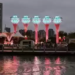 When the sun sets over Hefei, Huiyan Towers (徽盐·观澜府牌坊) come alive in full glow — a fusion of traditional Hui-style architecture and modern lighting. The twin pagoda-style towers, usually elegant by day, turn into neon lanterns of gold and crimson, reflecting beautifully on the nearby lake and walkways.