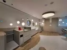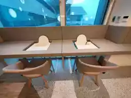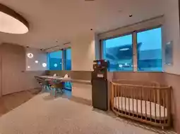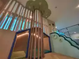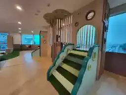 Taoyuan Airport's Terminal 2 offers a children's play area, located between the C5 and C6 lounges on the 3rd floor. This eco-friendly playground features a forest park theme, complete with a slide (unintelligibly closed on the day), a building block wall, and an interactive play wall. There are also facilities like a nursery and nursing room, seating, dining tables, and plenty of charging ports, making it convenient for parents to let their kids relax and charge their phones.