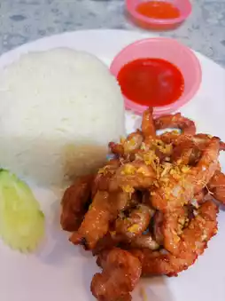 Fried Pork Rice: The skin is golden and crispy, and the meat is juicy and tender inside. Paired with a Thai sauce that's subtly sweet, salty, and hints of garlic, the aroma is so fragrant that just the smell will make your stomach rumble. This dish goes really well with rice and is a must-try for many first-time customers.