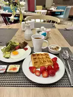 During my spring trip to Tashkent, I stayed at the Hampton by Hilton—and their breakfast buffet totally blew me away! The spread had everything: fresh salads, egg dishes, sausages, cheeses, ham, pastries, fruits… you name it. But the real MVP? The waffles. I loaded mine up with strawberries and drizzled on some honey—absolute heaven. The breakfast area was bright and welcoming, making it the perfect start to each day.