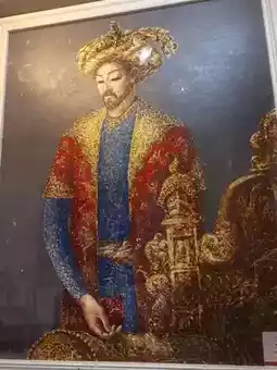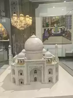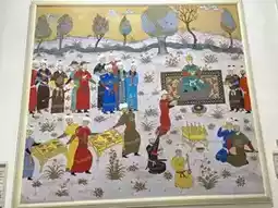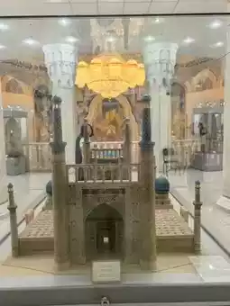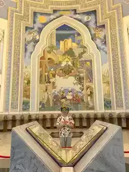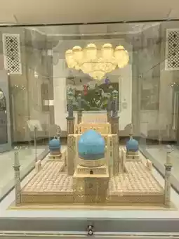 The most captivating is the “Cultural Treasures” section in the center of the exhibition hall. Here is displayed the world’s first standardized copy of the Quran, opened inside a temperature- and humidity-controlled case. The yellowed parchment features neat and flowing Arabic calligraphy, each letter like a carefully sculpted work of art. According to the guide, this Quran was compiled during Timur’s reign to unify religious texts, completed by the era’s top scholars and calligraphers. Its existence is not only a symbol of religious faith but also reflects the empire’s pursuit of cultural unity. On the wall beside the copy is a mural depicting Timur’s life: from his rise on the Central Asian steppes, to his expeditions to India and Asia Minor, and finally to his establishment of Samarkand as the capital with the construction of the magnificent Gur-e Amir mausoleum. Painted with vivid mineral pigments, the figures are lifelike, and the background palaces, battlefields, and markets form a three-dimensional “Timur biography,” narrating the legendary ruler’s life story.