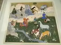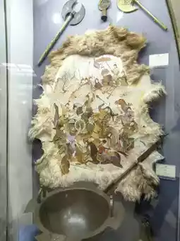 The military equipment and crafts exhibition area reveals the empire’s “craftsmanship and military strength.” A large tapestry hangs on the wall, dominated by red and blue tones, depicting a hunting scene: horsemen chasing antelopes, hunting dogs close behind, with grass and clouds woven in vivid detail. Such tapestries once decorated imperial palaces and symbolized power, their weaving techniques blending Persian and Central Asian methods, still astonishing today. Nearby, ceramic vessels with blue and white glaze echo the museum’s dome; the plant motifs and geometric patterns on the pottery are typical of Timurid ceramics, both practical and artistically valuable. Several ancient manuscripts lie on display stands, made from mulberry bark paper, featuring Persian and Arabic texts, including religious scriptures and literary works, directly testifying to the empire’s cultural prosperity.