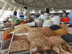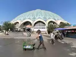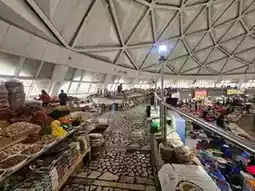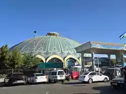 This is the Uzbek Central Market. Its exterior is a relic of the Soviet era, with a magnificent dome. Now used as a market, the vendors neatly display their produce. On the second floor, there's a nut stall. It's quite pleasant to browse, but I recommend checking prices before making any purchases. It's a great local market; if you have time, check it out. They sell local essentials at affordable prices.