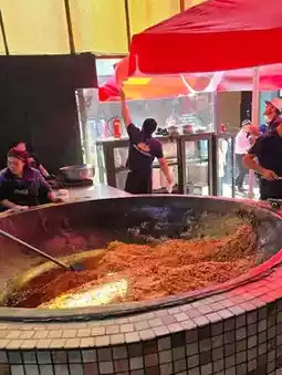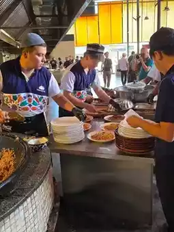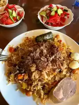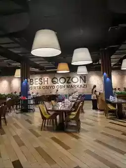 Besh Qozon, a magnificent multi-story restaurant, is renowned for its authentic Uzbek pilaf. On the ground floor, chefs stir giant pots of pilaf, drenched in grease and topped with tender chunks of meat. I ordered local bread, a plate of lamb pilaf, a few slices of horse sausage, and some dill salad to cut through the fat. The food arrived incredibly quickly, and the presentation lived up to its name. The pilaf was tender, and the carrots, rice, and raisins were fragrant—a truly delicious experience. A truly authentic Uzbek dining experience.