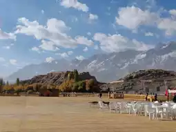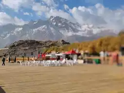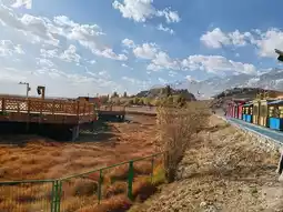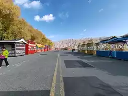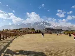 The Golden Grassland Square on the Pamir Plateau unfolds a magnificent picture under the autumn sun. The expansive golden wooden boardwalk stretches into the distance, complementing the snow-capped mountains, clear blue skies, and drifting white clouds. Unique transparent dome-shaped huts dot the landscape, adding a touch of modernity. Surrounding the area are vibrant small shops, the withered grasslands of the Aral Wetlands in the distance, and a stone monument depicting a golden eagle—all weaving a tale of the land’s rugged grandeur and delicate beauty.