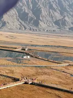The Golden Grassland is a magnificent wetland on the Pamir Plateau. In autumn, the meadow turns a shimmering gold under the sun. The Tashkurgan River flows through it, reflecting the majestic snow-capped mountains, blue sky, and clouds. Wooden walkways invite visitors to appreciate this blend of rugged and gentle highland scenery, creating a truly breathtaking natural masterpiece.