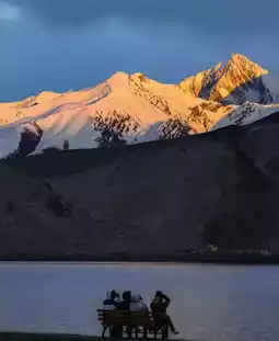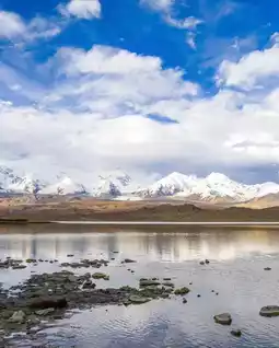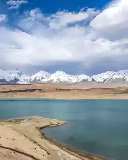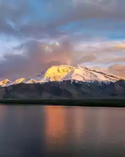 1️⃣ Karakul Lake shore: A stunning lake surface reflecting the golden mountain