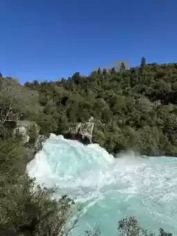 Huka Falls is located where the Waikato River narrows from approximately 100 meters to 15 meters. It's a spectacular waterfall where 220 cubic meters of water cascades down per second. The volume of water is enough to fill an Olympic-sized swimming pool in 11 seconds, and the sound of the waterfall can be heard from miles away.