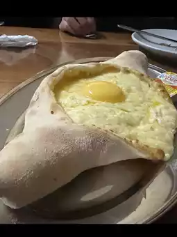 Another must-try is the boat-shaped bread "Adjarian Khachapuri." Mix the egg and butter together and enjoy it while it's hot—it's guaranteed to bring a smile to your face.