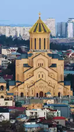 Start at the Holy Trinity Cathedral of Tbilisi, a monumental symbol of Georgian faith. This massive church stands tall on a hill, offering sweeping city views. Its interior is intricately decorated with paintings and natural light filtering through its stained-glass windows.