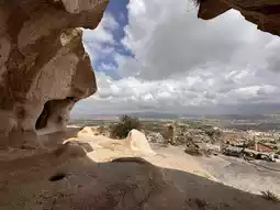 The castle itself, in the center of Uchisar Village. About 10 to 15 minutes by car or on foot from Goreme, via Pigeon Valley. Good access even at night