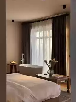 ■Kohler bathroom fixtures + comfortable mattresses offer modern comforts beneath a rustic exterior. A white porcelain bathtub 🛁 faces the mountain landscape, and the comforting touch of the shower warms every cold night.
