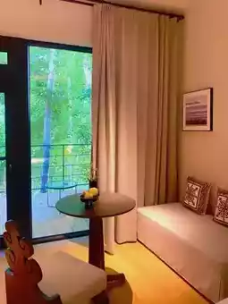 The carved sofa in the living room was actually repurposed from the old wooden beams of the house! Its surface has been reupholstered with off-white linen fabric, and the combination of vintage carved armrests and soft cushions is perfect. Sitting on it, sipping apricot tea brought by the housekeeper, and watching sunlight slant through the old wooden windows—it feels like time slows down.