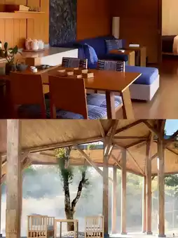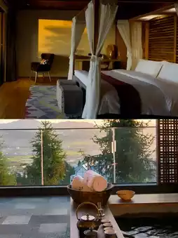 The hotel is surrounded by rare trees such as ancient tea trees, ginkgo trees, and rhododendrons, 🌲 creating a secret and tranquil atmosphere. The terrace is spacious and unobstructed, offering a panoramic view of the volcano and forest. The cliffside pool on the rooftop is a highlight and a must-visit spot for watching the sunset.🌄
