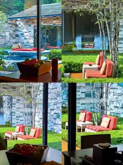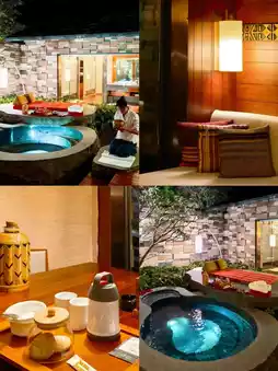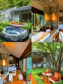Between the bedroom and the living room is a garden. On the right are garden chairs arranged side by side, and on the left is a hot spring pool carved from a whole piece of granite, introducing local carbonated hot spring water. The best thing about this place is that you can call to have the water filled and make a reservation, and there is also complimentary milk rose bath available. In the evening, there is a blessing and medicinal bath ceremony. Before soaking, there is a one-on-one blessing for good fortune, wealth, longevity, and happiness, which is very ritualistic. In addition, there are bedtime sweets and a handwritten leaf from the butler informing you of the next day's weather during turndown service.