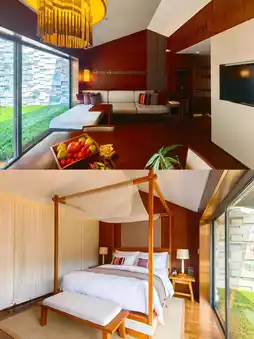 All rooms are detached villas, starting from 146 square meters. I stayed in a 168-square-meter grand single-bedroom hot spring garden art pool villa. Upon entering, there is a living room with a 24-hour butler service phone next to the L-shaped sofa. The response speed was very fast in the actual test. In-room spring water and a rich, complimentary minibar are standard. In addition to the guest bathroom, the living room also features a spa room with twin beds and a Nepalese singing bowl.