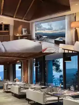 From the hotel room, you can overlook the entire Tengchong city and even see the volcano in the distance. The hotel’s design style is very aesthetic, with low-saturation color schemes and natural wood furniture, exuding a high-end feel! Dining at the hotel restaurant offers a 270-degree panoramic view, gazing at the crescent-shaped infinity pool that looks like holding a curved moon🌙 halfway up the mountain.