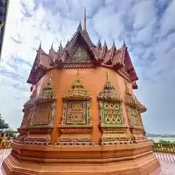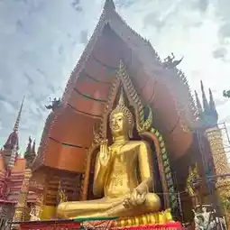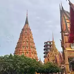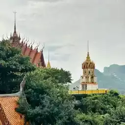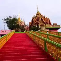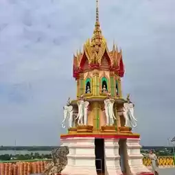 🐅 Tiger Cave Temple is another landmark that you can't miss when visiting Kanchanaburi. It stands out with a large golden Buddha statue and a towering Chedi Kaset Kaew Maha Prasat. The journey up to the top of the mountain may be tiring, but once you get there, you will be greeted by a beautiful view of the Mae Klong River and lush green rice fields. There are also three Naga stairs for you to walk up to experience nature, and a small tiger cave, which is the origin of the temple's name. The temple has a peaceful atmosphere, perfect for making merit and praying. I must say that you can get both happiness of the mind and eyes in one place.