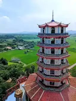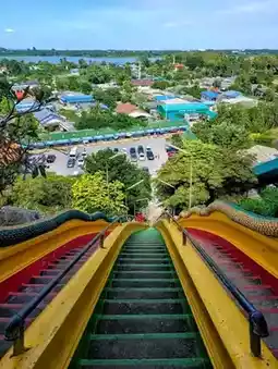 The temple is surrounded by padi fields, greenery and limestone mountains, offering breathtaking views. The ascent to the mountain peak involves climbing over 200 steep steps, which can be physically demanding, especially in hot weather. However, the effort worthwhile for the views and sense of accomplishment, rewards with panoramic vistas of the surrounding landscapes.
