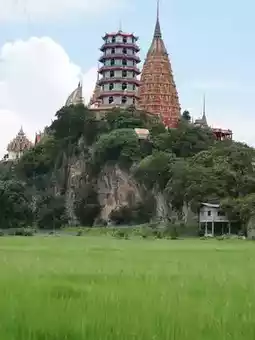 #Travel to save the world Today I had the opportunity to visit Kanchanaburi. Near Wat Tham Suea, there is a cafe and a famous Tom Yum noodle shop with hanging legs, which is Rak Khan Na. So I stopped by here. The atmosphere is very good. The green rice fields are close to nature. The cool breeze is very comfortable. You can also see the view of Wat Tham Suea. The menu I ordered was Tom Yum noodles and drinks like iced cocoa, green tea, and latte. The noodles tasted very good. The Tom Yum flavor was strong and the spiciness was just right. The drinks tasted good. The price is not expensive. After eating, you can go to Wat Tham Suea. It is just a short distance away. If you come to this cafe at noon, it might be crowded and a bit hot. I recommend coming before noon so that you can have a seat. #TravelKanchanaburi #KanchanaburiRestaurant #RakKhanNaCafe