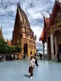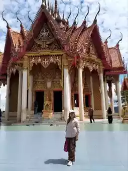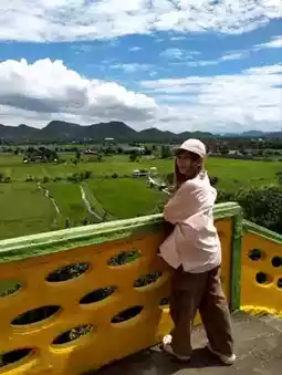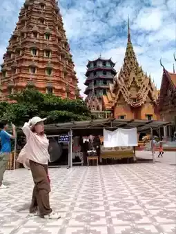 🐻 Hello, today I will take you to review a beautiful temple in Kanchanaburi. This is a famous temple in the province. Many people come to visit, both general tourists and locals. The highlight of this place is the large Buddha statue located on a mountain. You can see a 360-degree view from the top of the temple because it is on a mountain. It is convenient to travel up. You can drive up.