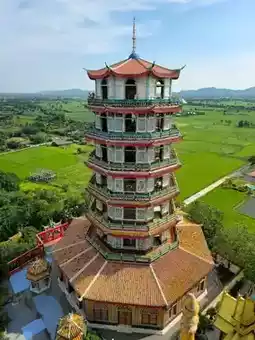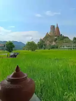 Scenic Views: Upon reaching the top of the temple, visitors are treated to a stunning panoramic view of the vast green rice fields and the Mae Klong River. Especially during the rice harvest, the golden hue contrasts with the temple's vibrant colors.