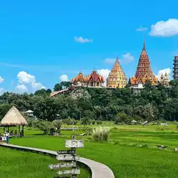 #Get a discount without relying on luck. This is another place you must check in. Don't miss it. Anyone who comes to visit Tiger Cave Temple, Kanchanaburi must stop by Mina Cafe. Beautiful view, rice fields, can see Tiger Cave Temple. Looking from above is beautiful, try looking from below, even more beautiful. Going on a holiday, there will be a lot of people. Whoever is convenient, go on a weekday, it's better. And go in the late afternoon, the weather won't be hot. The shop opens at 9:00 a.m., closes at 7:00 p.m. If you go to the temple and want to find a place to drink or eat something, go here. It's near the temple, beautiful view. #Get a discount without relying on luck.