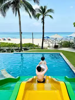 This viral hotel lives up to the hype! We stayed in a sea-view room on the 3rd floor of the Thani Wing, where the balcony opens up to coconut trees and turquoise waters—pure bliss! The room is a bit dated but the bed is super comfy and not damp at all. The highlight? The pool areas! Two zones with slides kept the kids entertained until they were completely worn out. Plus, the free kids' club lets you have an hour to yourself. And the breakfast? Unbeatable! Semi-outdoor seating with ocean views, freshly made burgers, and a chocolate fountain. Picture your child twirling with cotton candy under the sun—every moment feels like a scene from a heartwarming movie.
