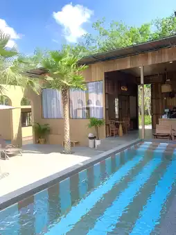 There is a swimming pool, an air-conditioned area with a view of the outside.