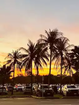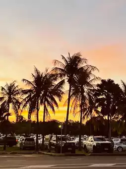 Coconut Grove Ambiance: Silhouetted palm trees against a fire-streaked sky create postcard-perfect moments