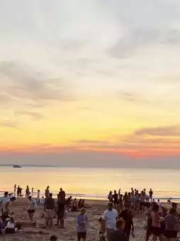 Vibrant Atmosphere: Join locals and travelers gathered like a festival crowd, cheering as the sun touches the water
