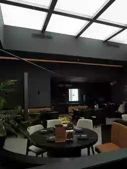 The main color is dark, with a black marble table and dark gray walls.