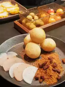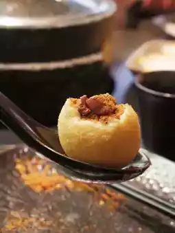Actually, it is fried potato balls, served with fried oil residue, spicy cumin powder and pickled radish, and the overall texture is relatively dry.