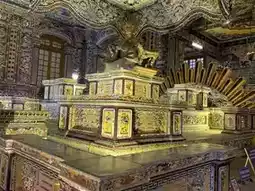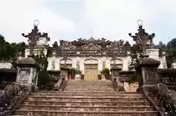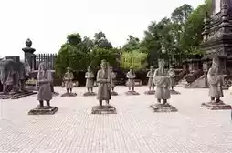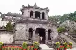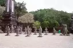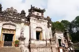 The three middle halls of the Thien Dinh Palace are the royal crypt and the altar hall. The flooring inside the Palace are granite. Elegant inlaid ceramic and glass fragments bas reliefs adorn the walls. Inside the Khai Thanh Temple, a bronze statue of Khai Dinh sits above the burial. This bronze statue was cast in France in 1920. The whole arena is glistening in gold.