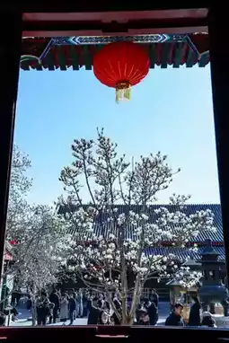 🌸Take photos of the white magnolias with the ancient architecture: red windows, blue couplets, and black plaques. In the distance, you can see the yellow glazed tile roof of the Daxiong Baodian Hall.